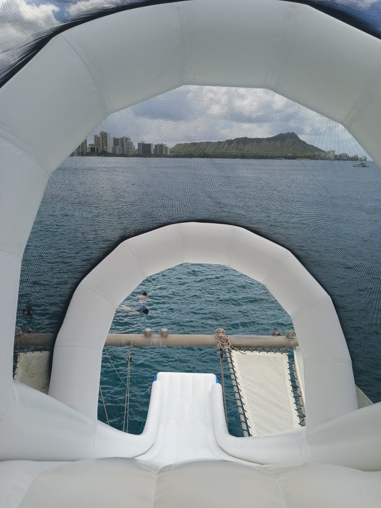 Additional activities included are Snorkeling, Water Slide, Trampoline, Kayaks, Stand up boards and controlled Jumping from the top deck.