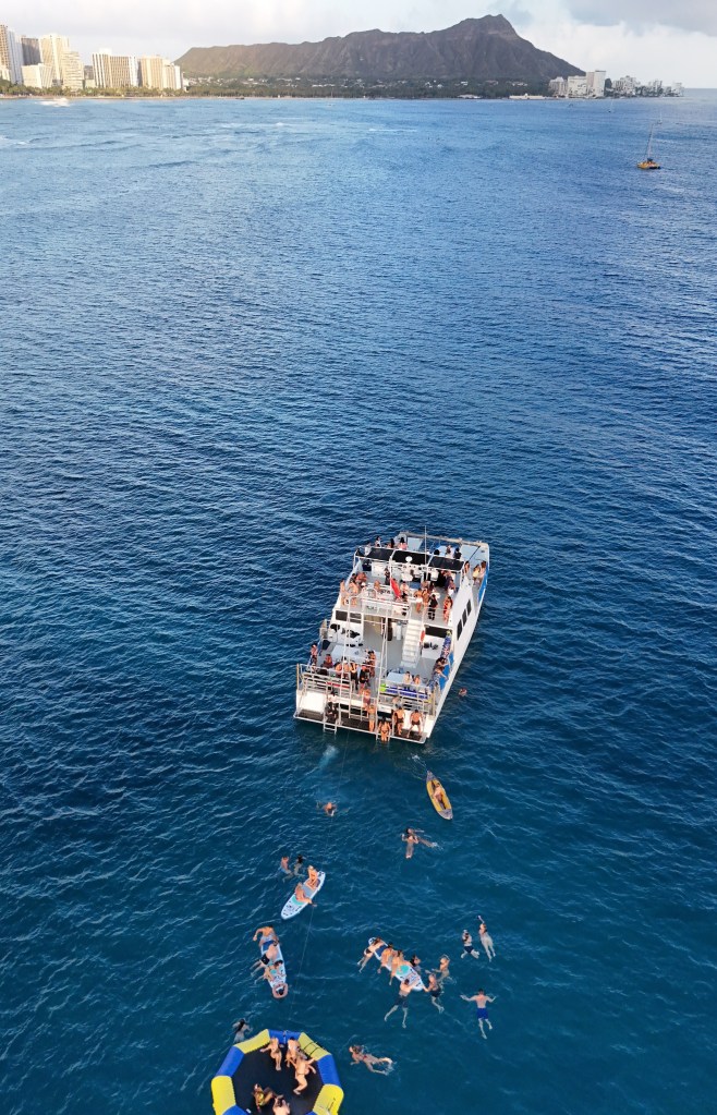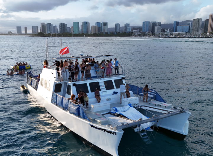 Choose this Amazing 65′ foot, 130 passenger double decker power catamaran to cruises the south shore of Oahu which is featured here. The focus of this charter experience is your special event and or viewing of the natural beauty of Hawaii, including possible Whales from November through May, Dolphins, Colorful Reef Fish, Spectacular Sunrises or Sets and Fireworks on Friday nights, to name a few.